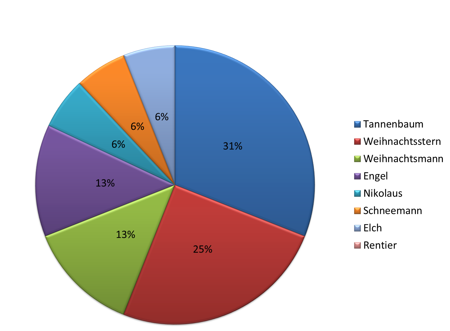 Für den Tannenbaum als Weihnachtssymbol wurden 5 Stimmen abgegeben. Nur eine Stimme weniger erhielt der Weihnachtsstern (4 Stimmen). Auf dem dritten Platz landeten der Weihnachtsmann und der Engel mit je 2 Stimmen. Platz vier teilen sich Nikolaus, Schneemann und Elch. Für diese drei Weihnachtssymbole wurde jeweils nur eine Stimme abgegeben. Das Rentier ging leer aus.